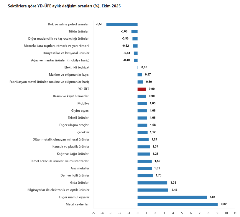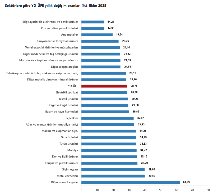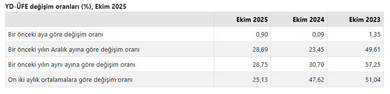Türkiye İstatistik Kurumu ekim ayı Yurt Dışı Üretici Fiyat Endeksi (YD-ÜFE) rakamlarını açıkladı. Buna göre YD-ÜFE 2025 yılı Ekim ayında bir önceki aya göre yüzde 0,90 artış, bir önceki yılın Aralık ayına göre yüzde 28,69 artış, bir önceki yılın aynı ayına göre yüzde 28,75 artış ve on iki aylık ortalamalara göre yüzde 25,13 artış gösterdi.